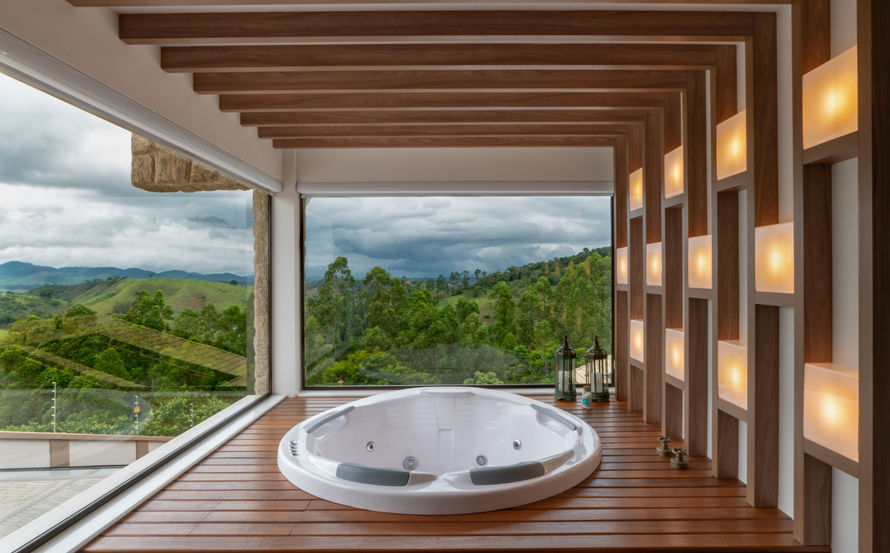 O pé direito duplo não só valoriza o ambiente, como também contribui para o aproveitamento da iluminação natural e maior integração com a vista, possibilitada pela janela em esquadria fixa criada acima do pé direito duplo que emoldura a paisagem.